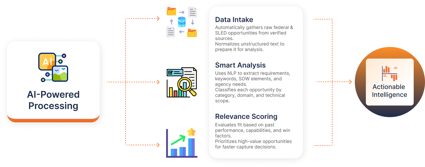 At the heart of Capture Intelligence lies AI-Powered Processing — transforming raw opportunity data into actionable intelligence. Using natural language processing (NLP) and machine learning, the system analyzes SOWs, extracts essential requirements, and scores each opportunity based on potential fit and relevance.
