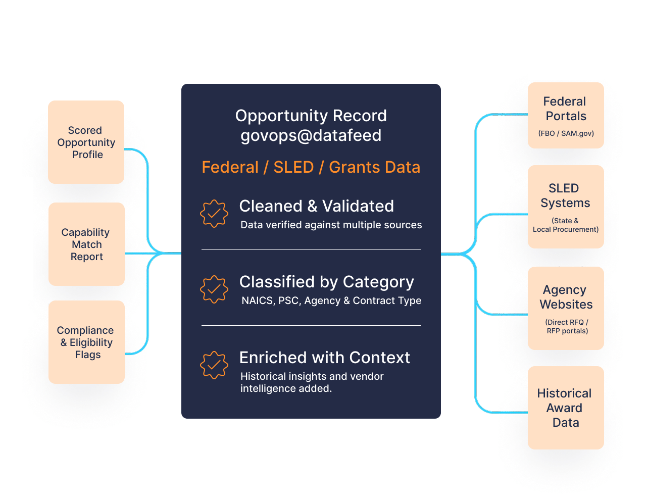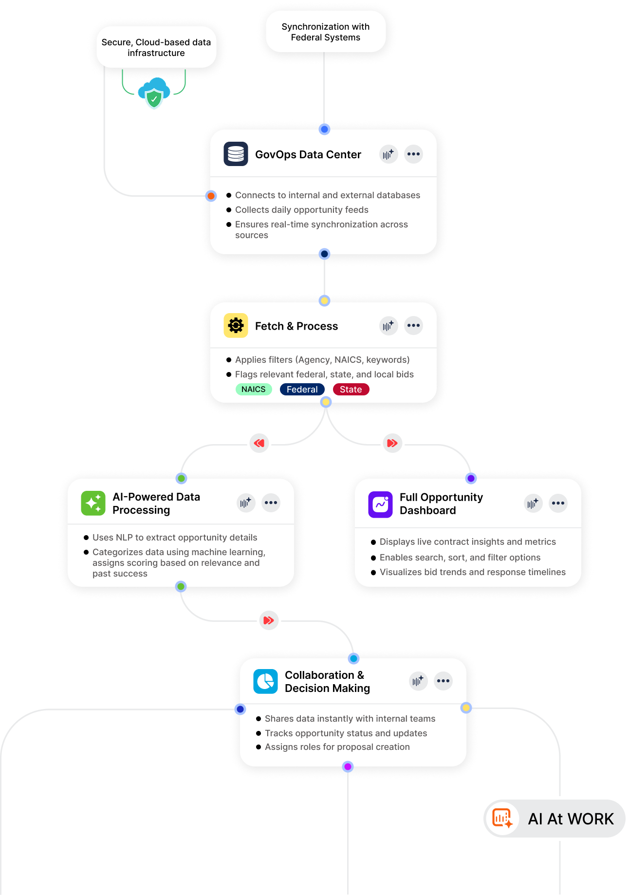 Once opportunities are stored, GovOps automatically fetches and processes them through intelligent data pipelines. This system cleans, classifies, and enriches every record to ensure the highest quality insights downstream.