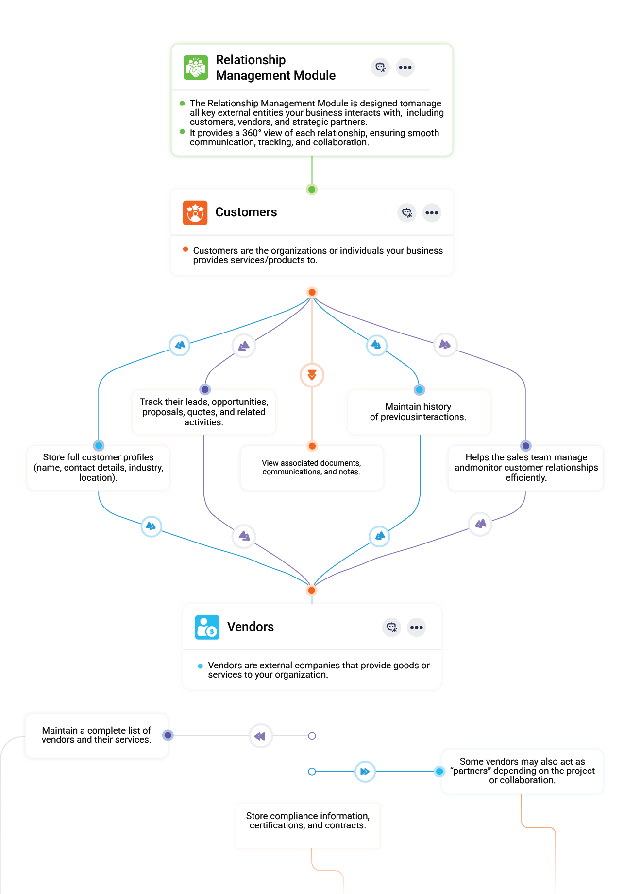 The Relationship Management Module gives your organization a unified space to manage every external entity you work with — customers, vendors, and strategic partners. Capture complete profiles, track all interactions, and maintain a 360° view of each relationship. From sales engagements to vendor compliance, the module ensures structured data, smoother communication, and better collaboration across teams.