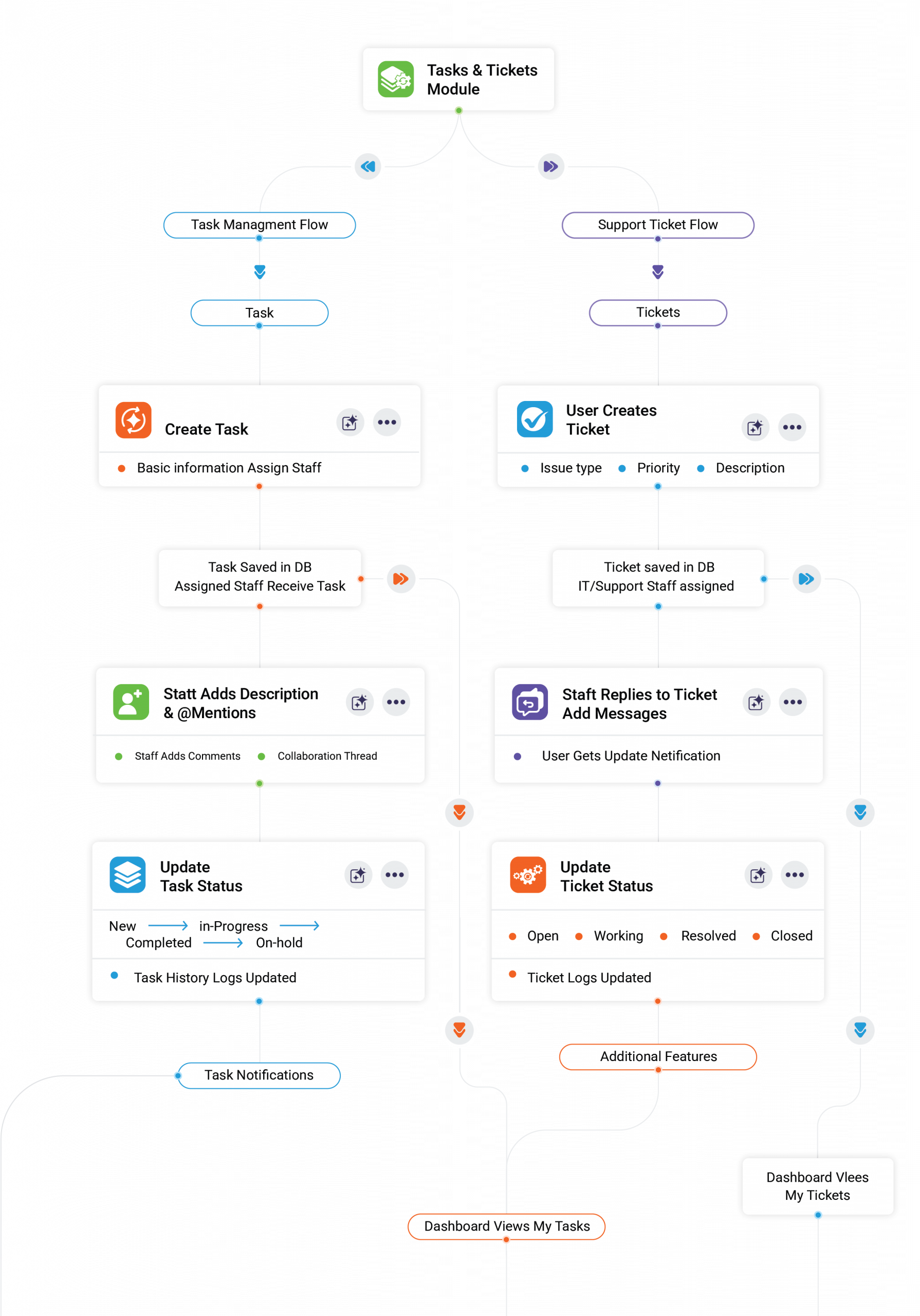 Streamline internal work and support operations in one centralized system. Create tasks, resolve tickets, assign responsibilities, collaborate with your team, and track every update through a clean, connected workflow.